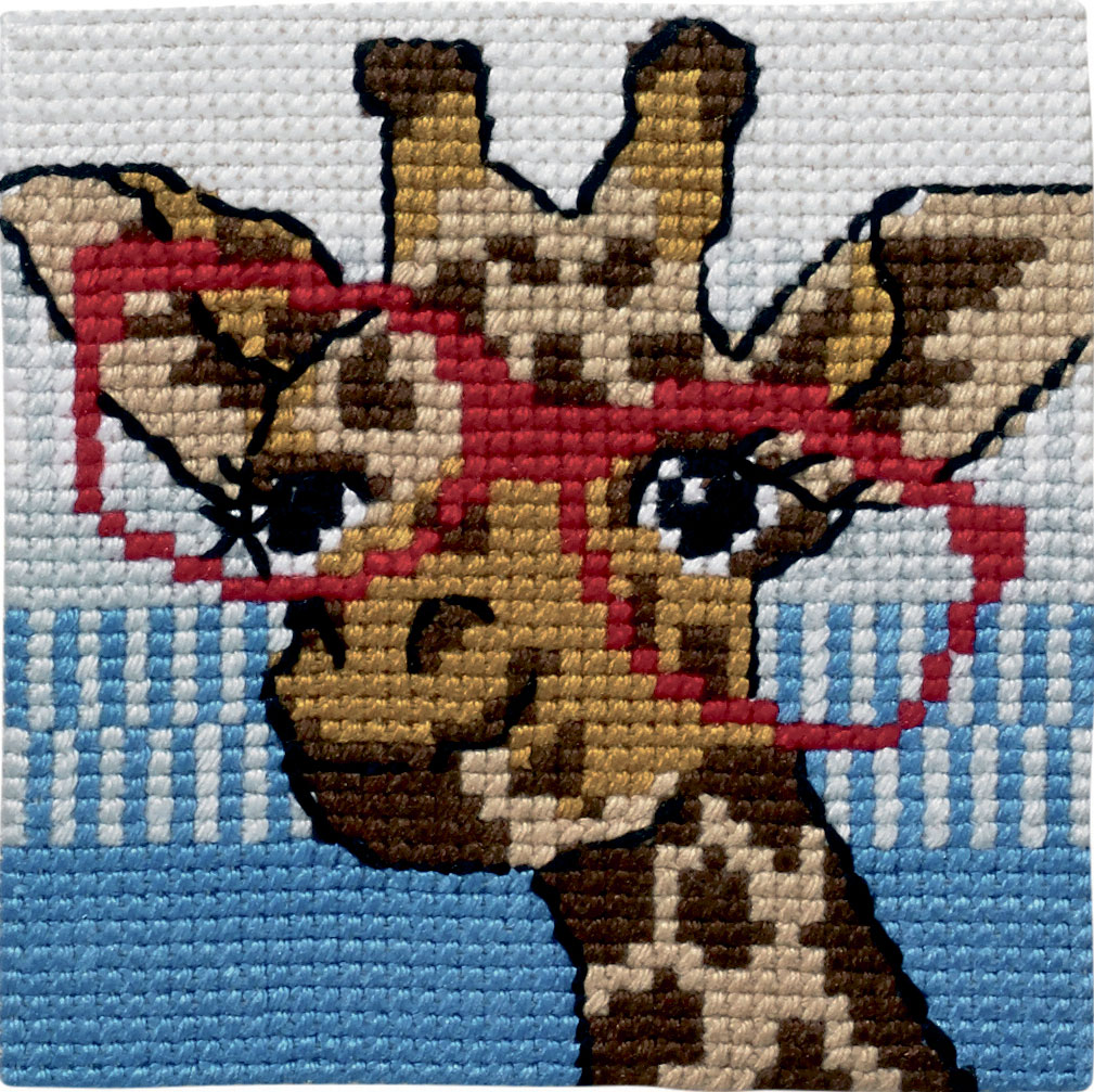 Permin broderikit med giraf med brillermotiv som er fortrykt i forvejen. Påmalet broderi som måler 25 x 25 cm i groft stramaj. Til børn og nybegyndere som gerne vil lære, at brodere., Så er dette sagen, at starte med. Du kan ramme den fint ind bagefte
